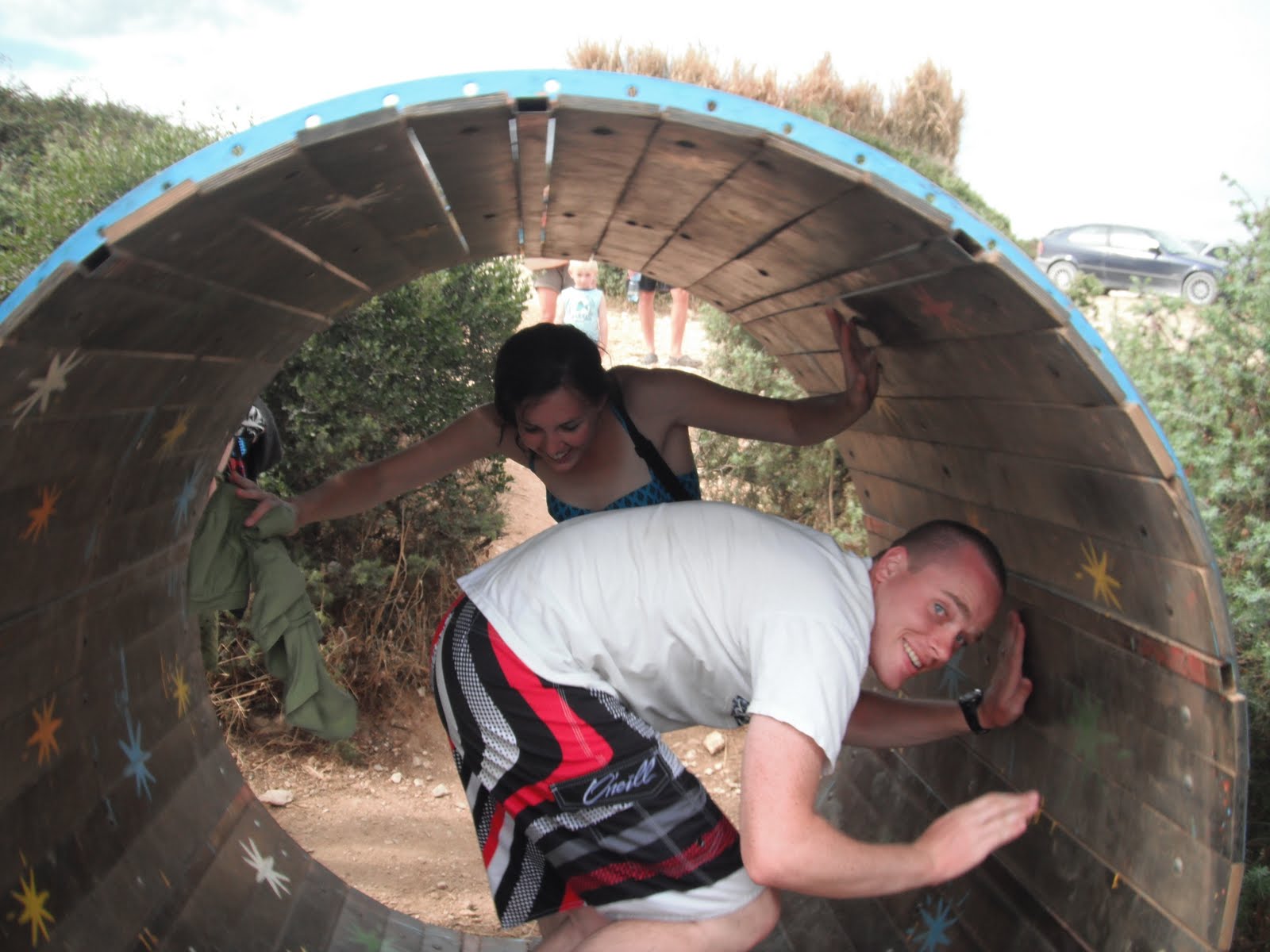 Pula Croatia is home to a few fun sites including the coolest “tiki bar” you’ve ever seen. It’s in the tall grass and you wander through the little paths in the grass to areas that open up for tables or different things to play on, including this big rolling barrel, some giant swings, a merry go round, and other random things.